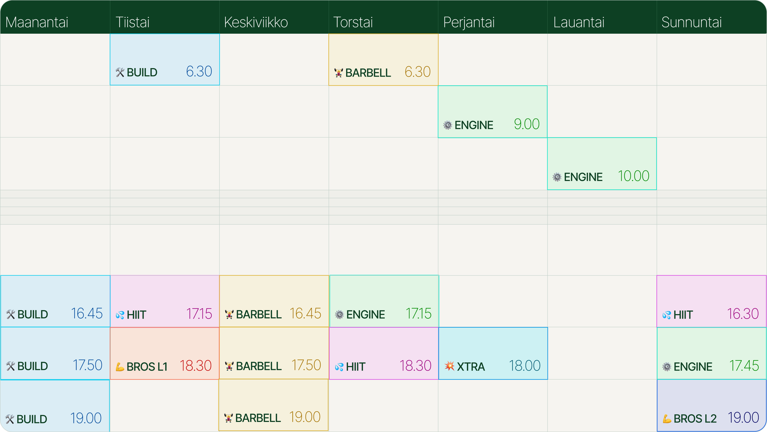 AIKATAULU SPRING SCHEDULE 2.1.-21.5.2026 Näytä täysikokoisena Näytä täysikokoisena SUMMER SCHEDULE 1.6.-31.8.2026 AUTUMN SCHEDULE 1.9.-20.12.2026 Näytä täysikokoisena TULE MUKAAN! Liity jäseneksi